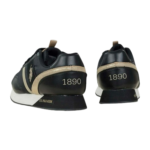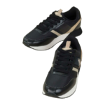 Γυναικείο μαύρο sneaker με χρυσές λεπτομέρειες και με εξωτερική επένδυση από οικολογικό δέρμα, υψηλής ποιότητας και textile. Η εσωτερική του επένδυση είναι από textile. Διαθέτει μαλακό, αποσπώμενο πάτο και αντιολισθητική σόλα.